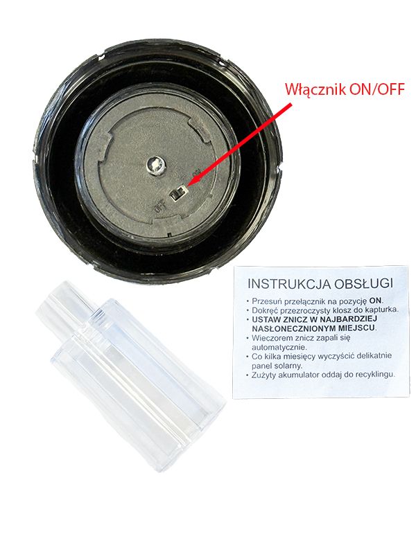 - Aby włączyć panel solarny należy delikatnie odkręcić plastikowy sopel rozpraszający światło i przesunąć włącznik do pozycji ON