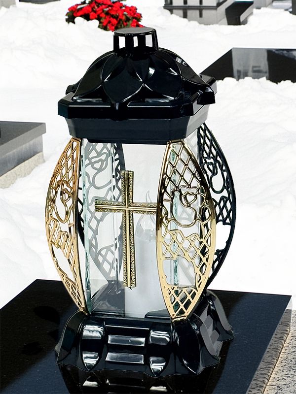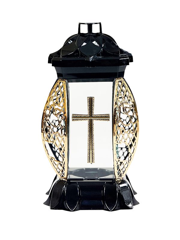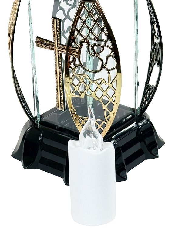 Znicz szklany 13 Kwiat z Krzyżem + wkład Led Abemo (złoto)