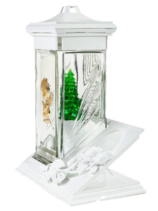 Znicz szklany okazjonalny nawiązujący do świąt Wielkanocnych. Motywem zdobniczym jest żółty pisklak w otoczeniu wiosennych kwiatów uwidocznionych za pomocą delikatnego brokatu. Uroku dodają cieniowane stopniowo szkło i dodatki w kolorze starego złota.