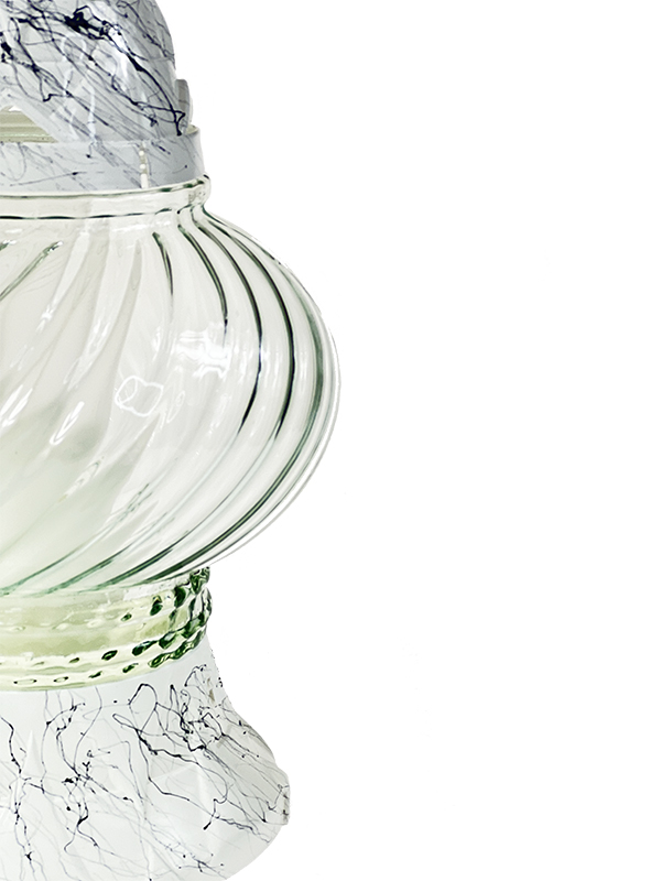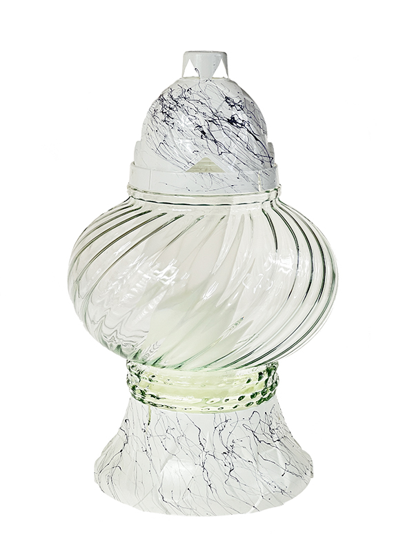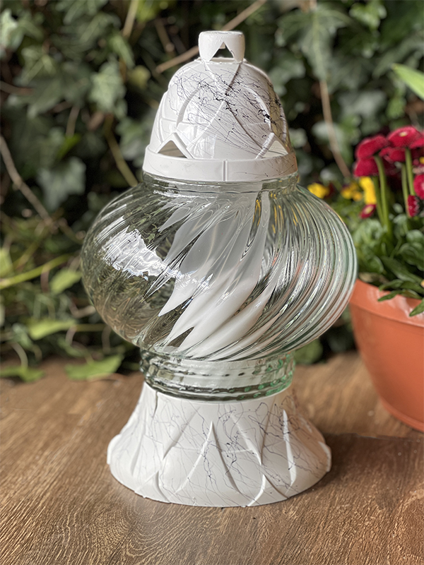 Elegancki znicz szklany w kształcie kuli. Uroku dodaje ryflowane szkło ,które pięknie rozprasza światło oraz białe dodatki imitujące marmur.
