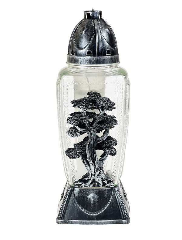 Wysoki znicz na grób z wkładem wymiennym i dekoracją w kształcie drzewa bonsai to świetny wybór. Znicz zapewnia jasne światło w ciągu dnia i nocy. Drzewko bonsai tworzy piękną dekorację i daje przyjemny, spokojny klimat.