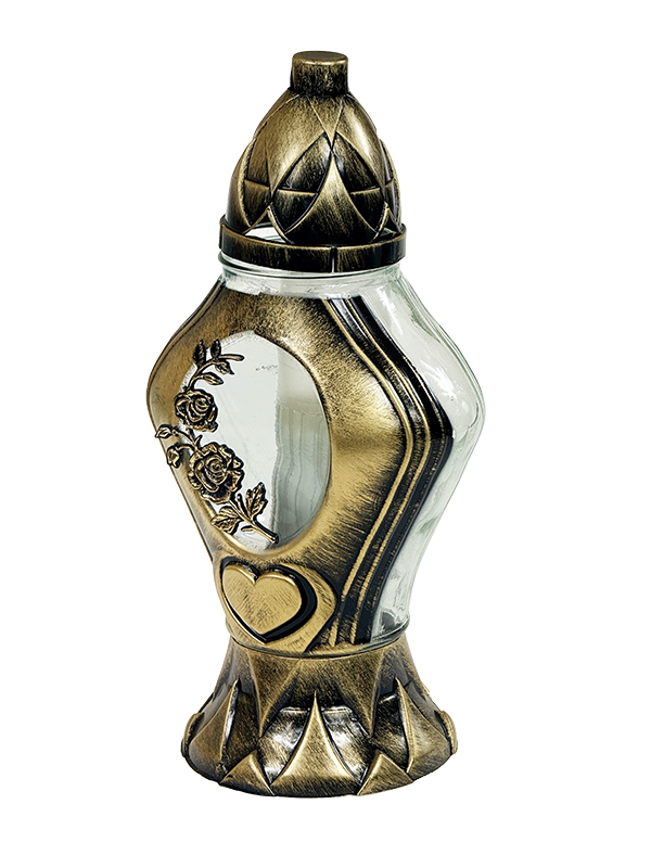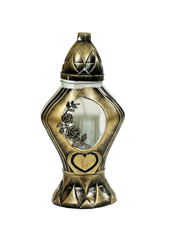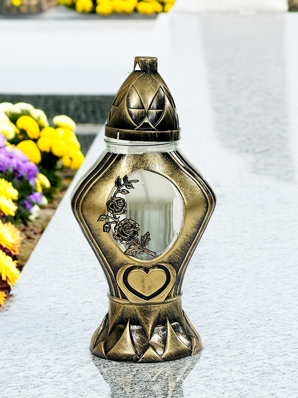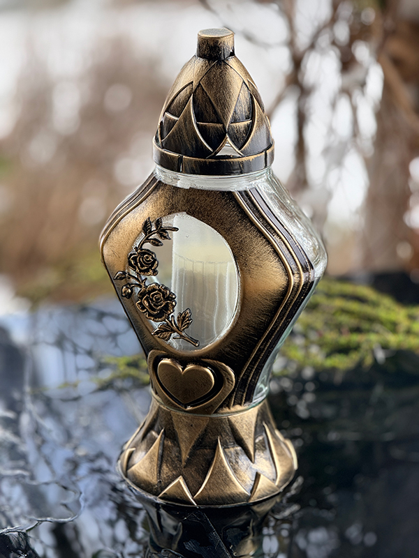 Oryginalny szklany znicz z klasycznym parafinowym wkładem. Piękne, pozłacane zdobienia w postaci serca i róży dodają mu uroku i wyjątkowego charakteru.